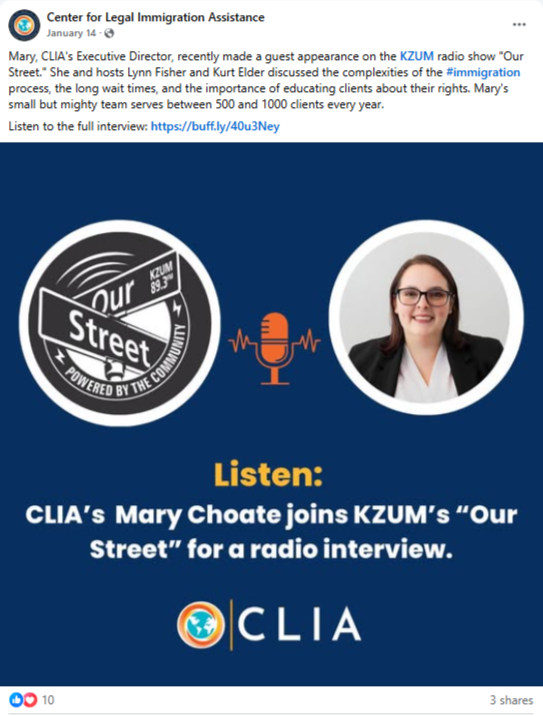 We amplified CLIA's reach by securing media placements. A feature story about CLIA's work with a Honduran immigrant was published in the Lincoln Journal Star, and we pitched stories to local radio outlets and podcasts like KZUM and Agency for Change.