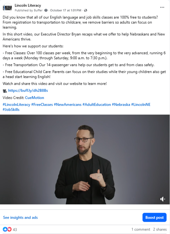 Lincoln Literacy is a nonprofit organization dedicated to helping people of all ages and backgrounds improve their literacy skills. Since 2022, Stingray Writing has served as a fractional marketing director, helping them build a consistent, mission-driven presence to amplify their impact and grow their community of supporters, donors, and volunteers.