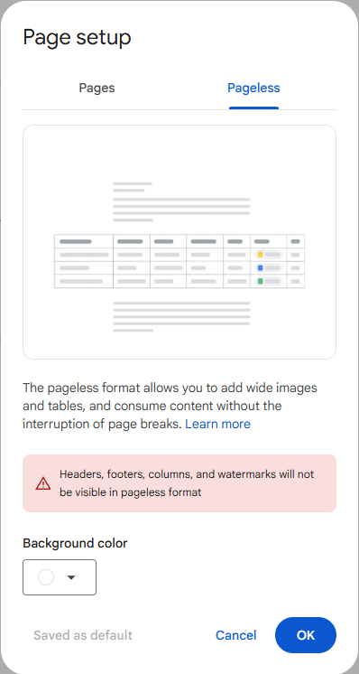 To achieve a more seamless layout and save yourself some overwhelm, I recommend using a Pageless format. In Google Docs, go to File > Page Setup > Pageless.
